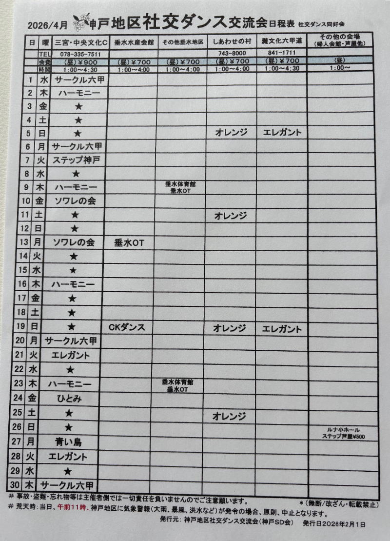 ・4月25日(土) 13:10~15:45 \500 日生社交ダンス愛好会