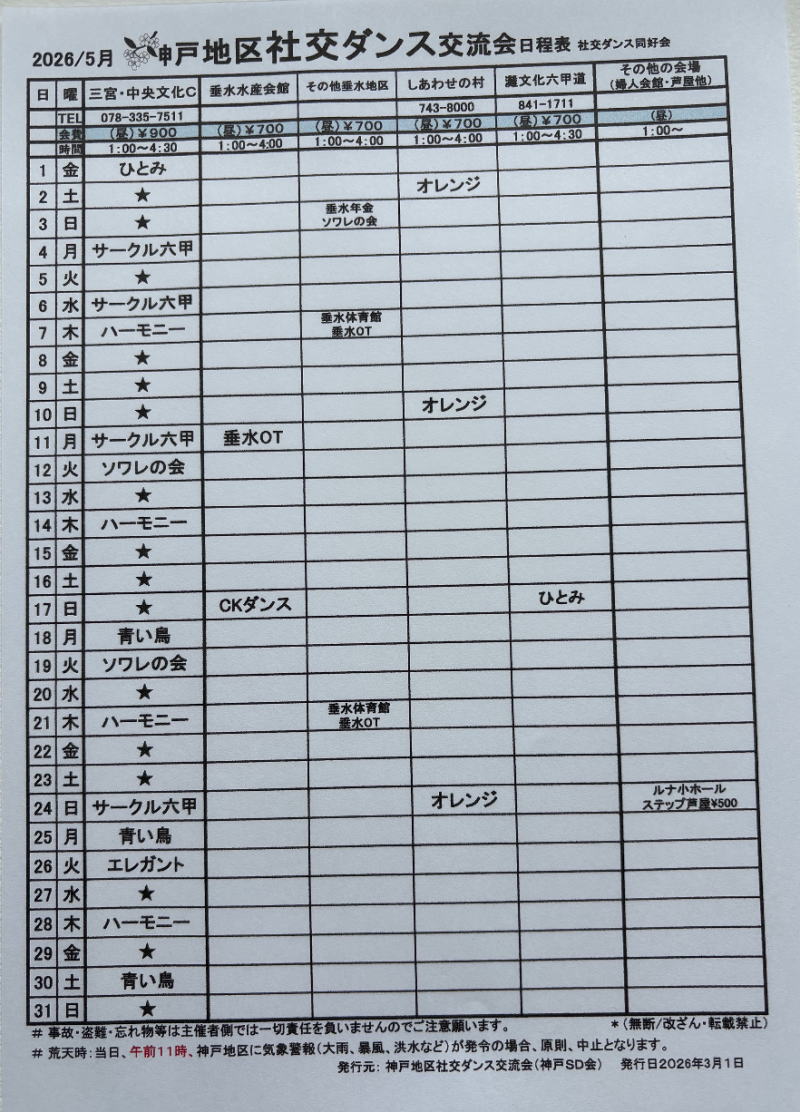 ・5月23日(土) 13:10~15:45 \500 日生社交ダンス愛好会